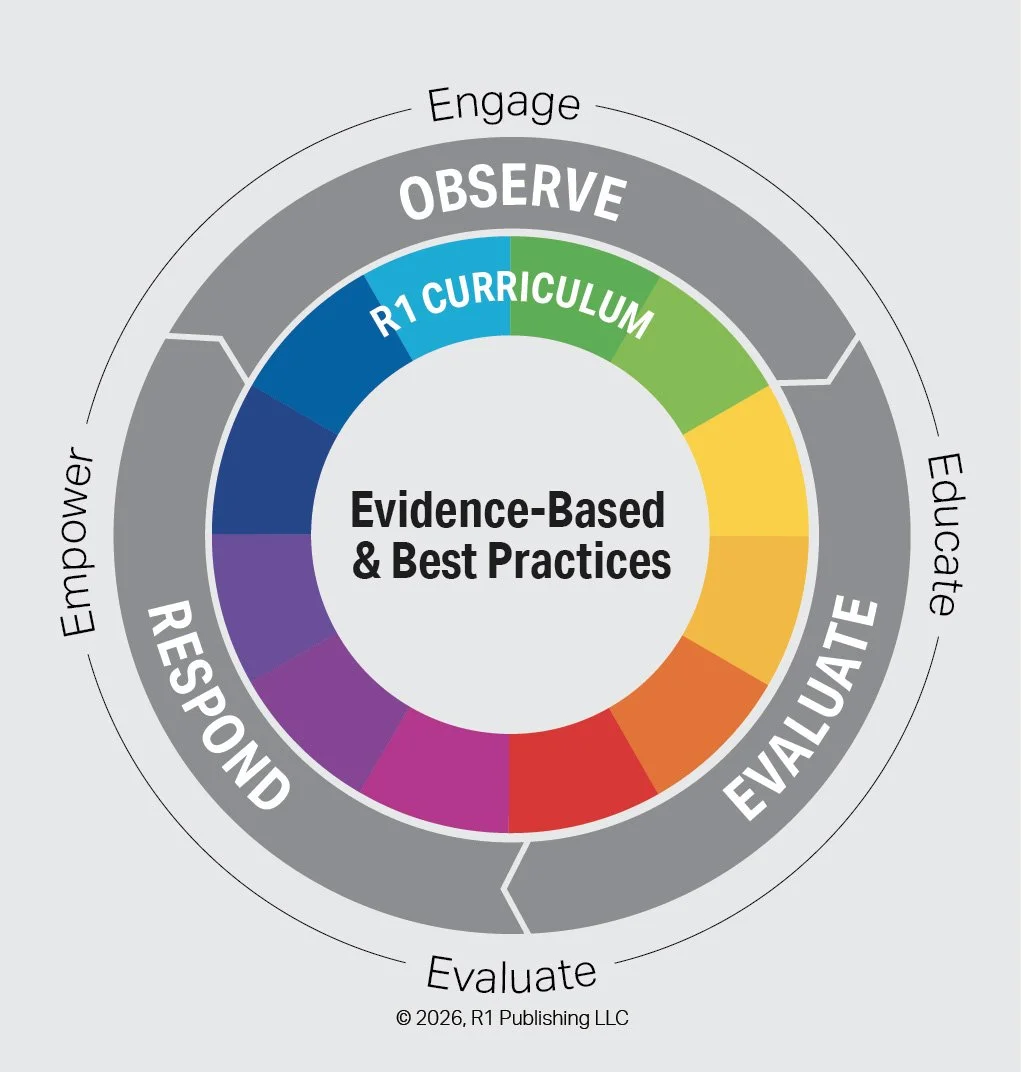 The examples above illustrate just one aspect of the R1 Learning Process at work within one activity of one topic. The structure is at work comprehensively across each activity, topic, and curriculum. This pervasive interplay of the process helps to strengthen the practice and provide individuals with the self-efficacy to see, understand, and address the challenges they face. Repetition reinforces that confidence, increases motivation and application of the process, and builds the skills for change. .