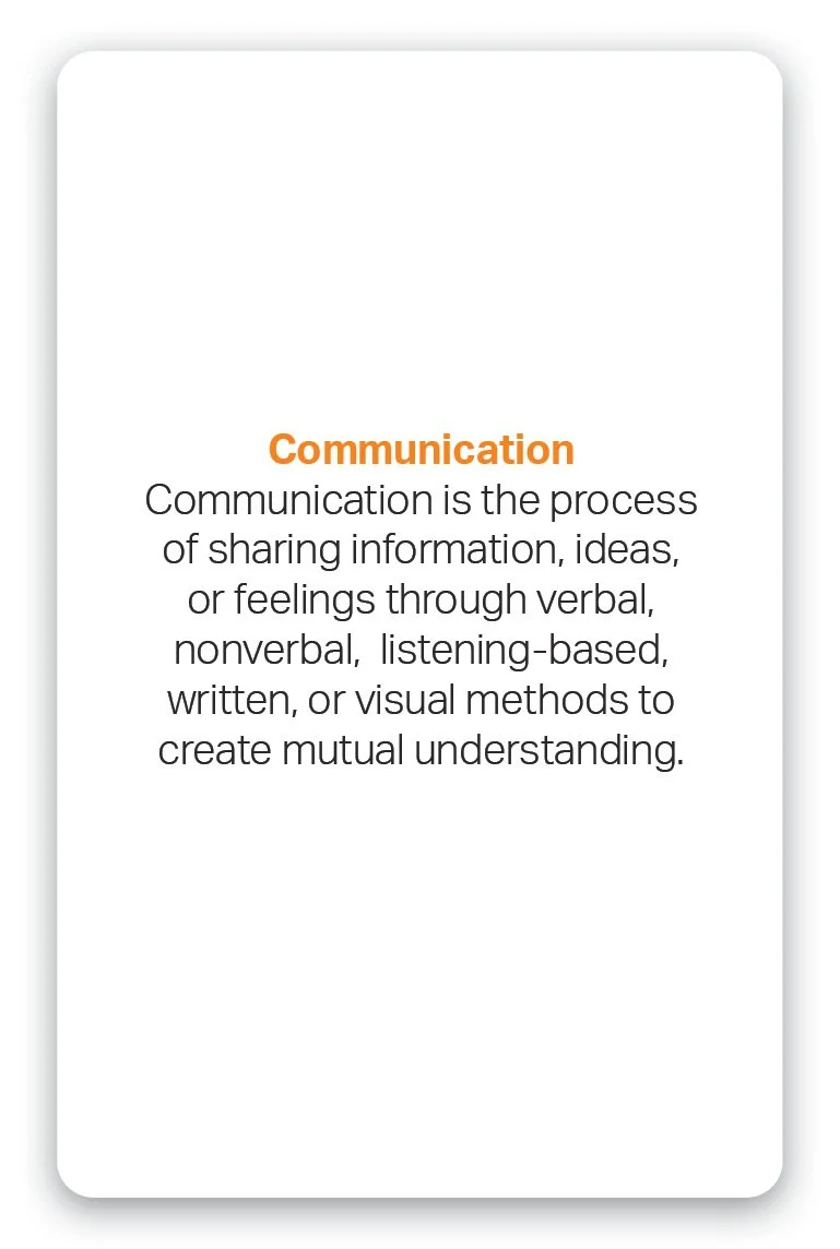What is communication? Communication is the process of sharing information, ideas, or feelings through verbal, non-verbal, listening-based, written, or visual methods to create mutual understanding.