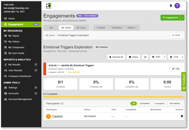 An engagement is a facilitated learning session, a specific piece of content assigned to specific individuals with a clear timeline and trackable outcomes. It can be for a group session, a one-on-one, or a self-paced assignment. It can contain a card-sorting activity, a topic video, a knowledge-check, a worksheet, or even content your organization has purchased or created on its own.