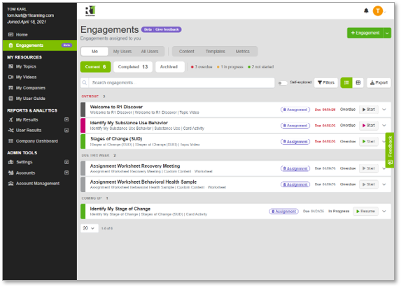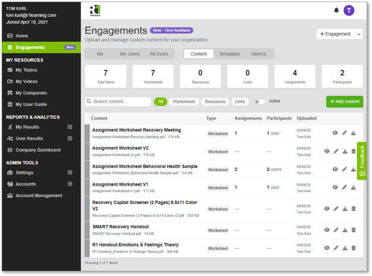 Your content, alongside ours. R1 Discover already offers over 200 learning assets including interactive activities, videos, and worksheets. But we know your program has its own materials: worksheets, PDFs, articles, videos, blog posts, and more that are central to how you work. The Engagements Content Library lets organizations upload and manage their own resources right alongside R1's library, so practitioners can assign from one unified set of content.
