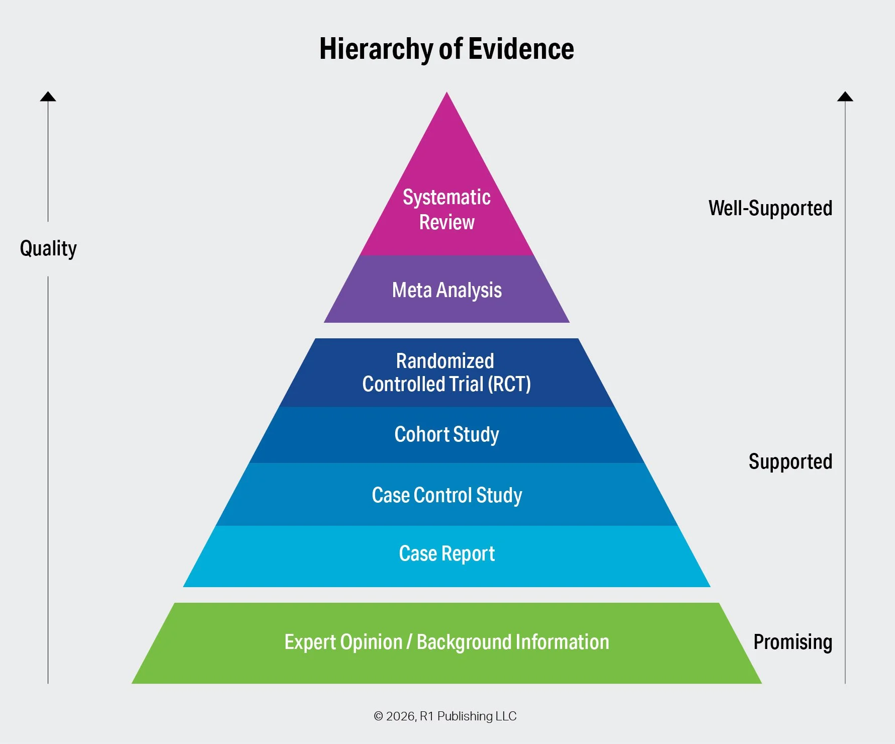 Let’s start with the basics of how treatments, tools, and interventions become evidence-based over time. The primary types of evidence include the following, listed from highest to lowest strength: