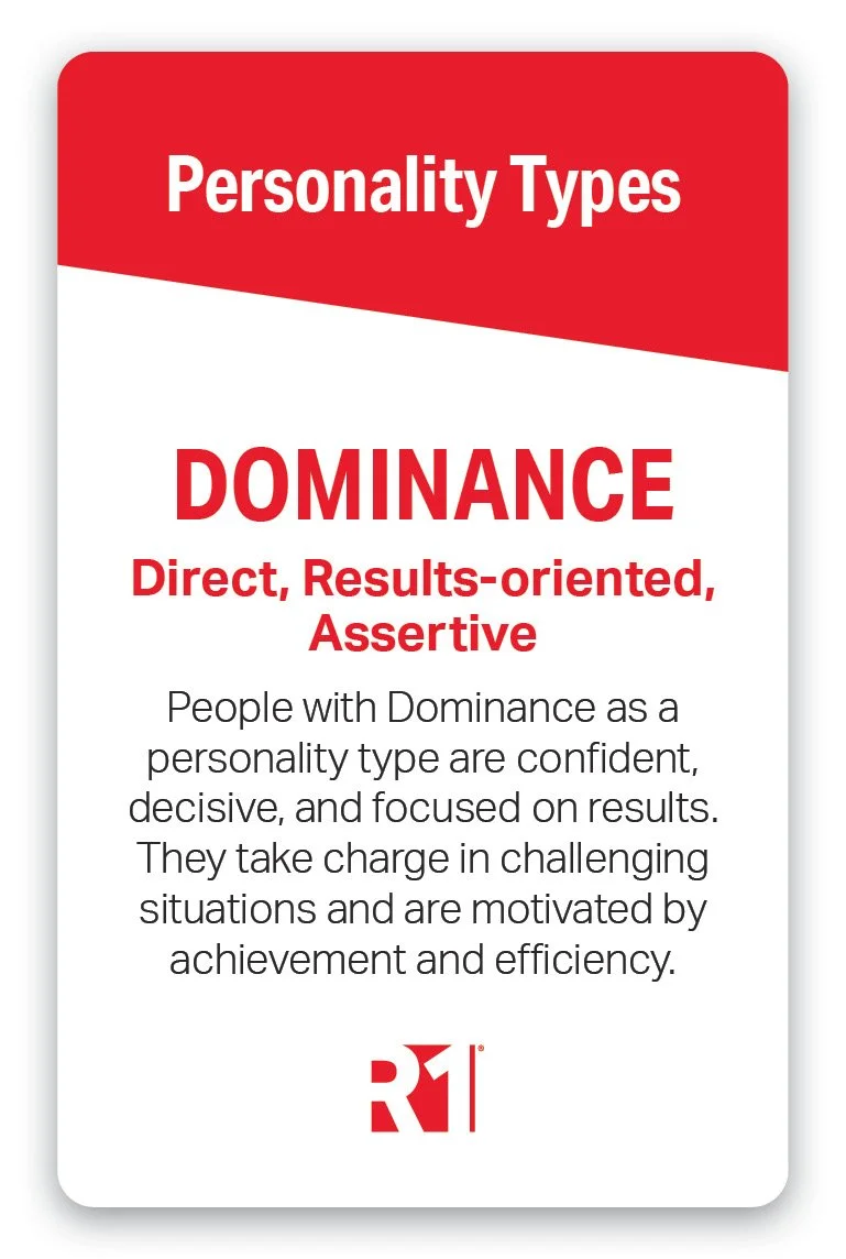 Dominance — Direct, Results-oriented, Assertive: People with Dominance as a personality type are confident, decisive, and focused on results. They take charge in challenging situations and are motivated by achievement and efficiency.