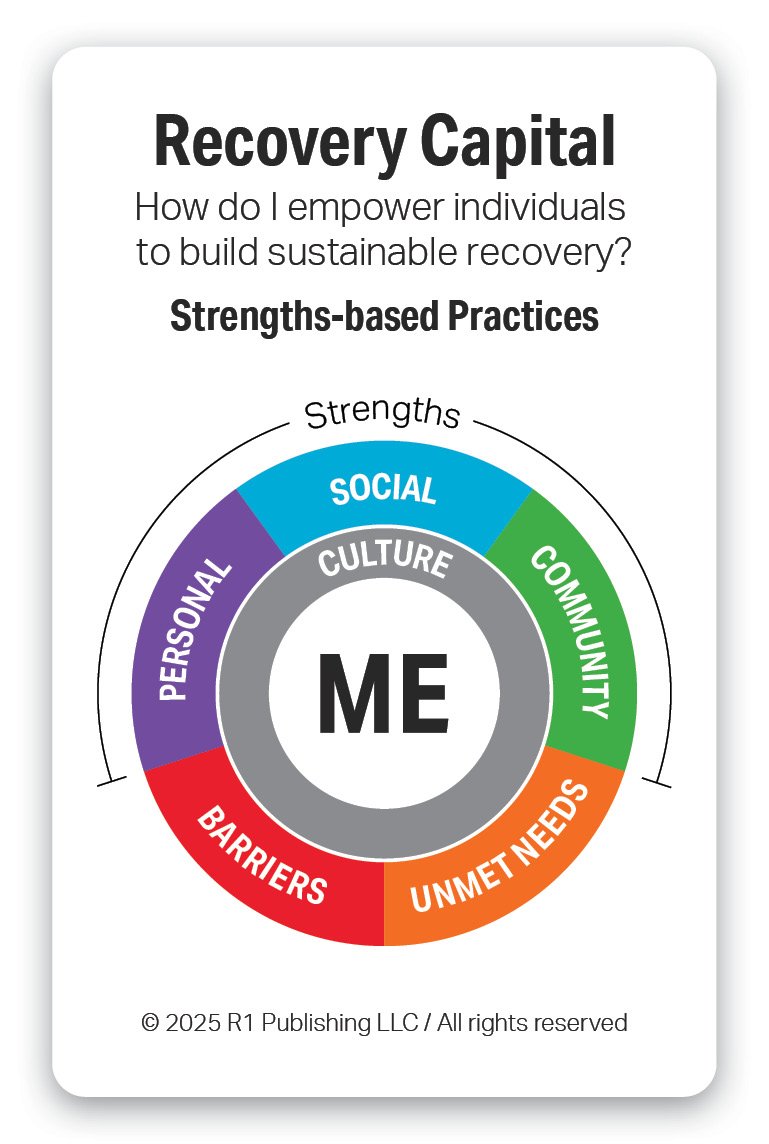 R1 enhances Recovery Capital by providing assessments, tools, and training for successfully implementing recovery capital with a wide range of populations in a variety of settings. Our Recovery Capital Screener (RCS-36) provides the measurement and directional framework for structured engagement. Our Recover Capital tools provide a strength-based approach for engagement, education, and goal setting. All of the topics in the R1 Learning System and on the R1 Store are mapped to the Recovery Capital model and provide a wealth of videos and activities for on-going exploration and impact.