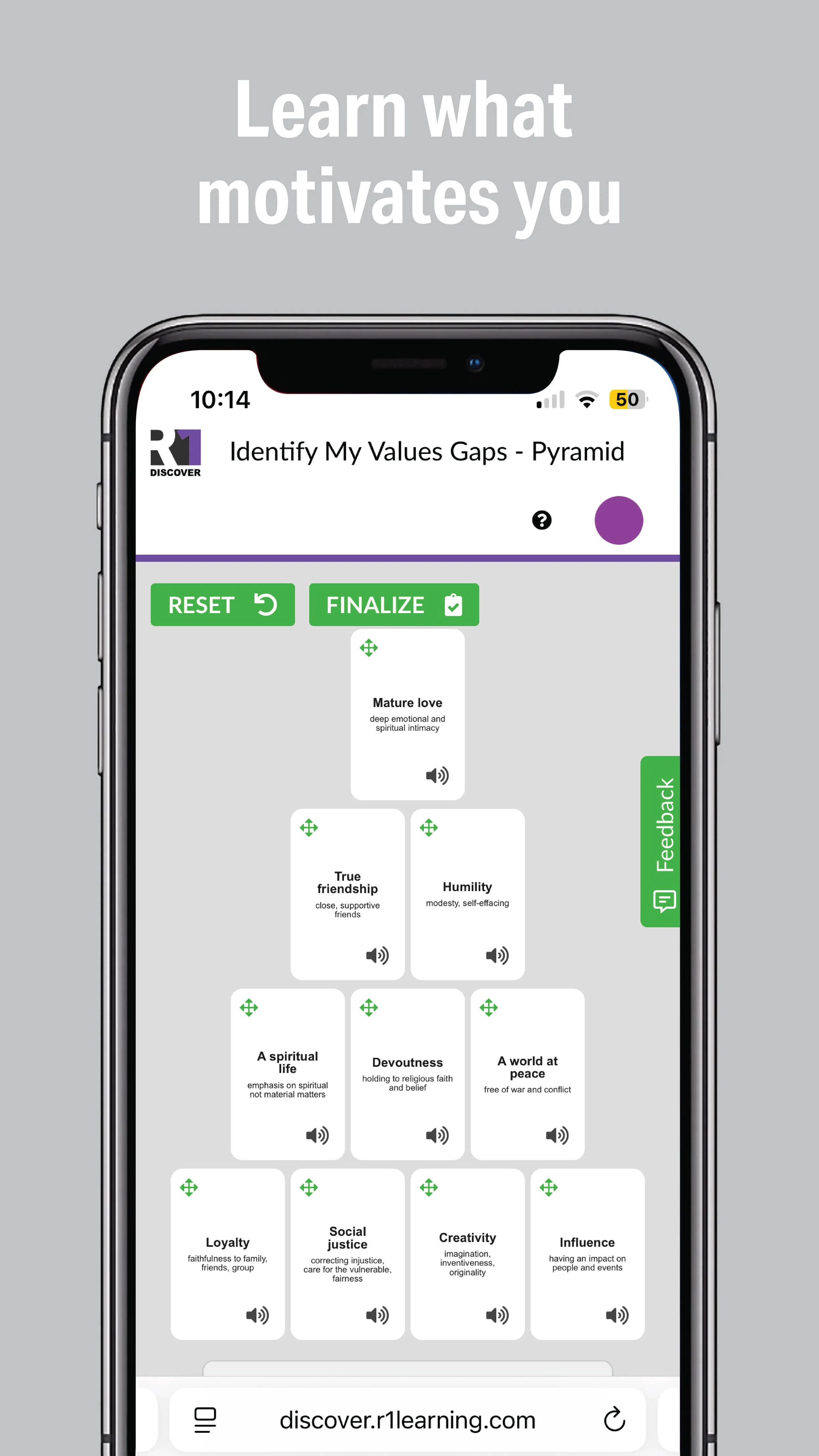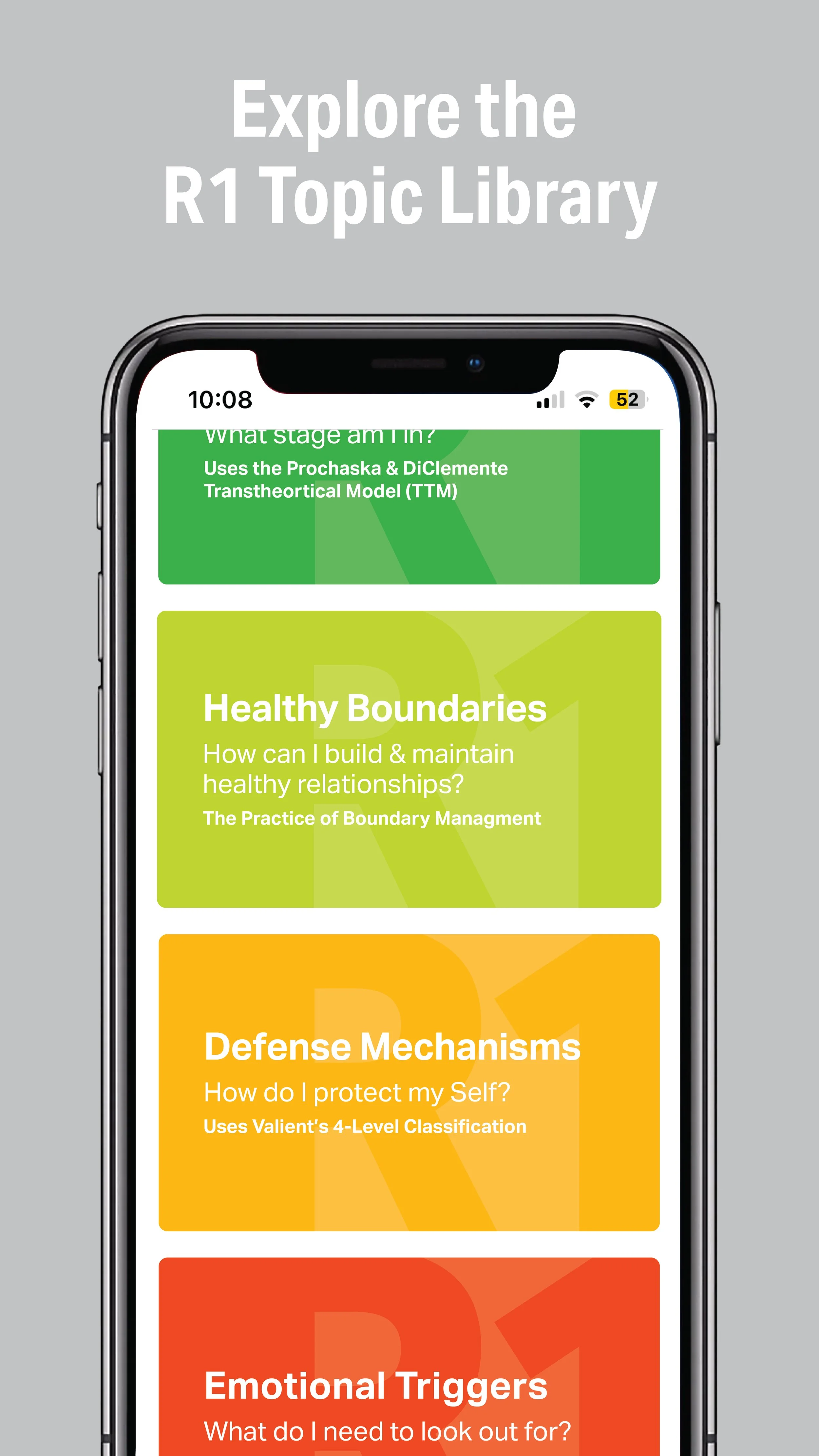 R1 Discover transforms leading evidence-based models and research into engaging, gamified educational assessments that drive self-discovery, motivation, and sustained engagement. Designed to drive the use of evidence-based practices such as Motivational Interviewing (MI) and Cognitive Behavioral Therapy (CBT), R1 Discover empowers learners and equips practitioners to increase engagement, track progress, and improve outcomes.